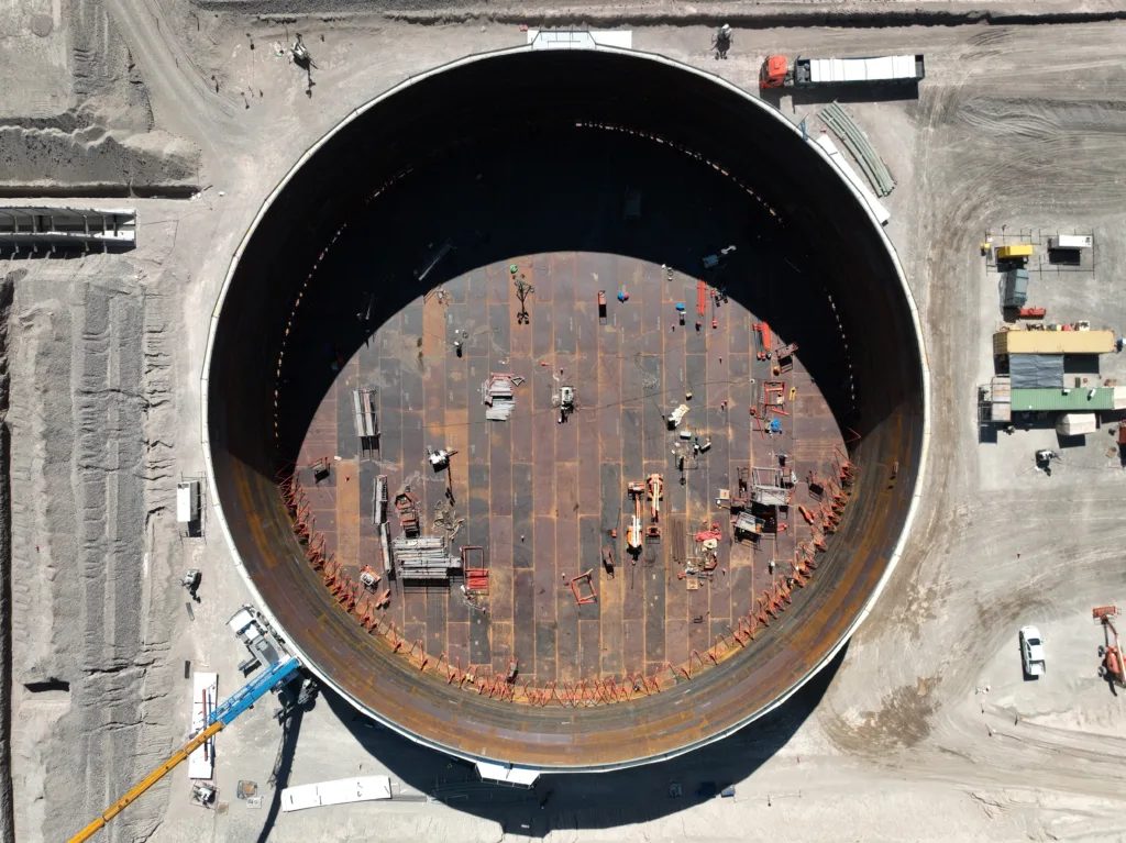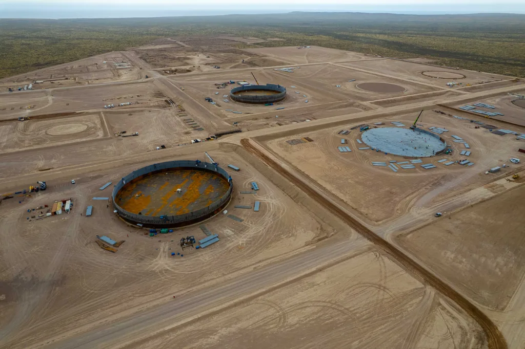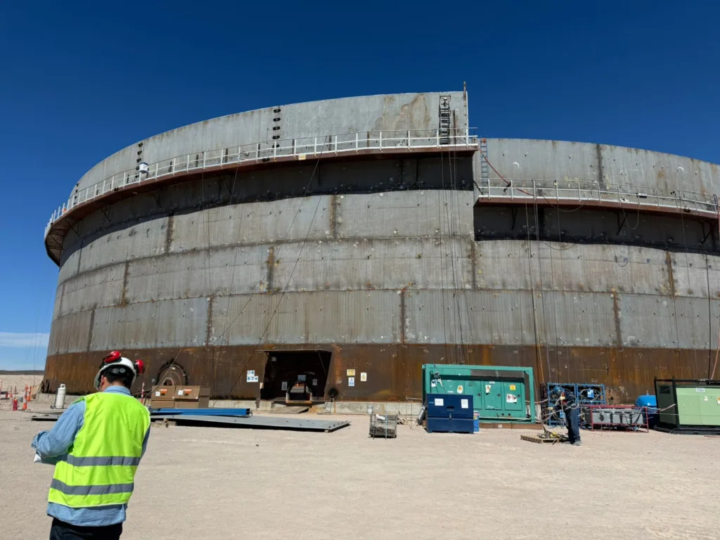 El punto final del recorrido del VMOS, la Terminal Punta Colorada, también exhibe transformaciones visibles. En esta zona se completó la construcción de virolas en los tanques TK404 y TK401, mientras se intensifican las tareas de movimiento de suelos y el despliegue del campamento. Durante todo 2026, el foco principal en esta área estará puesto en la obra marina.