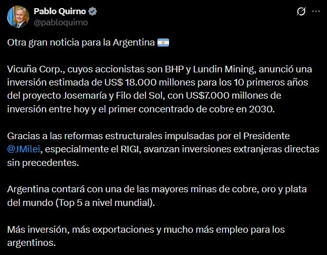 El anuncio también fue presentado publicamente por el canciller Pablo Quirno, quien a través de su cuenta en X expresó que «Argentina contará con una de las mayores minas de cobre, oro y plata del mundo (Top 5 a nivel mundial). Más inversión, más exportaciones y mucho más empleo para los argentinos».